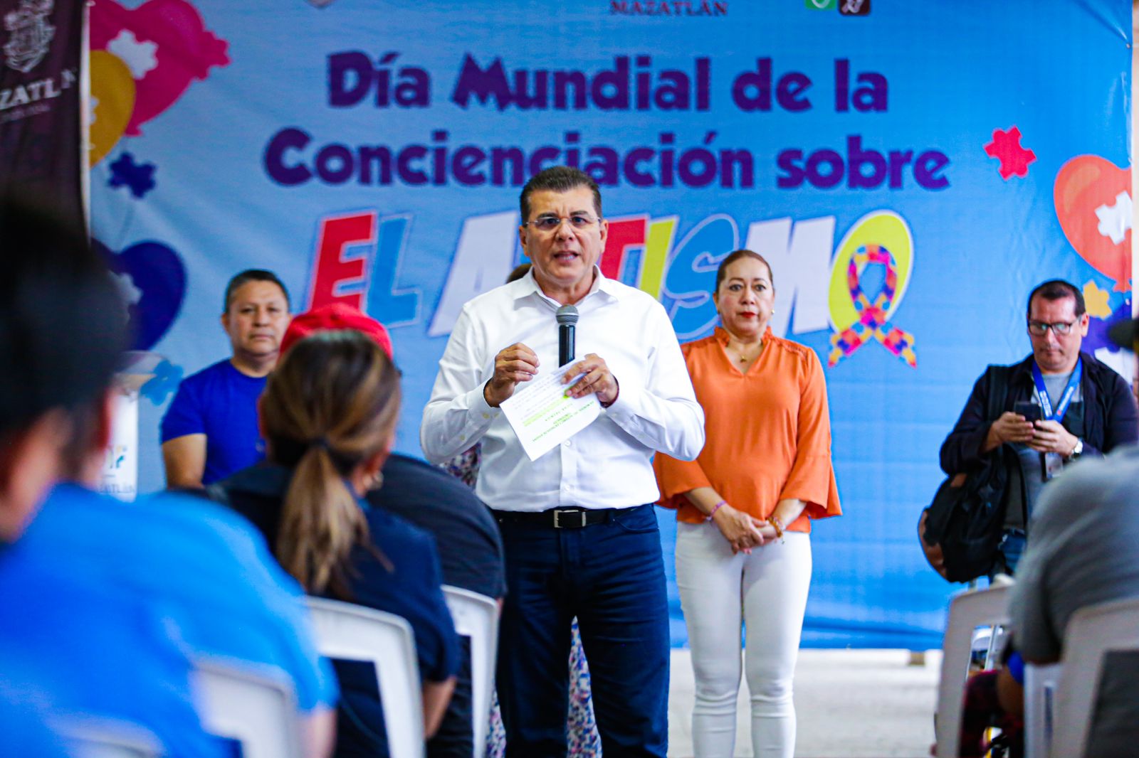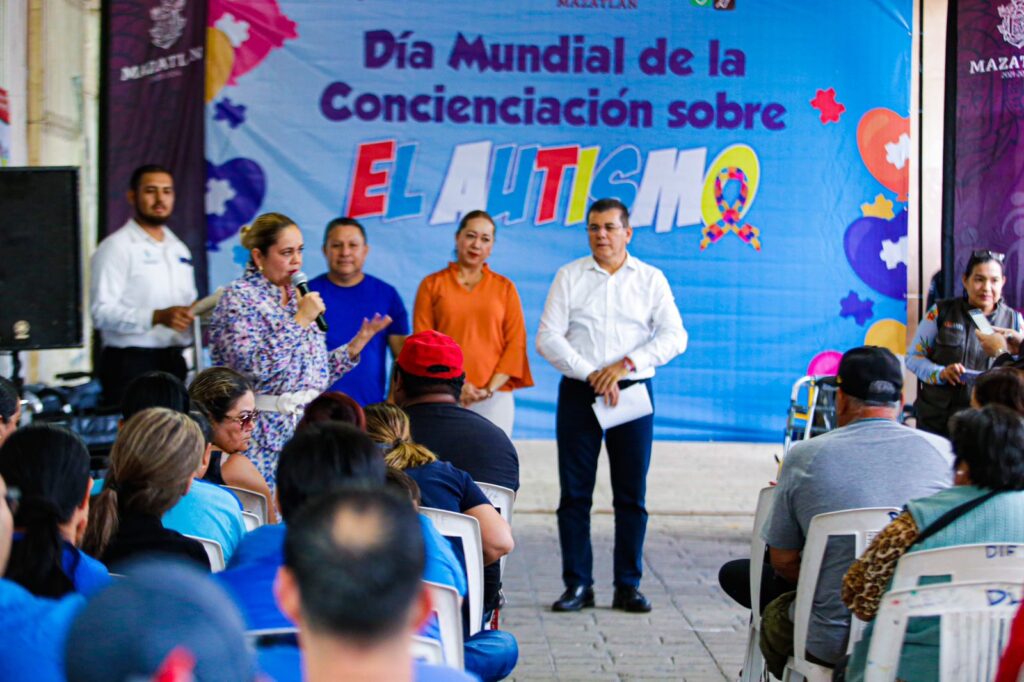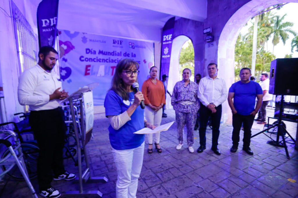 Mazatlán, Sinaloa, a 03 de abril de 2023.- Con el color azul como el símbolo del diario vivir de las personas con autismo en la iluminación de la fachada de Palacio Municipal, y la entrega de ayudas funcionales diversas, el Gobierno Municipal y DIF Mazatlán conmemoraron el Día de la Concienciación del Autismo, celebrado el pasado 02 de abril.
