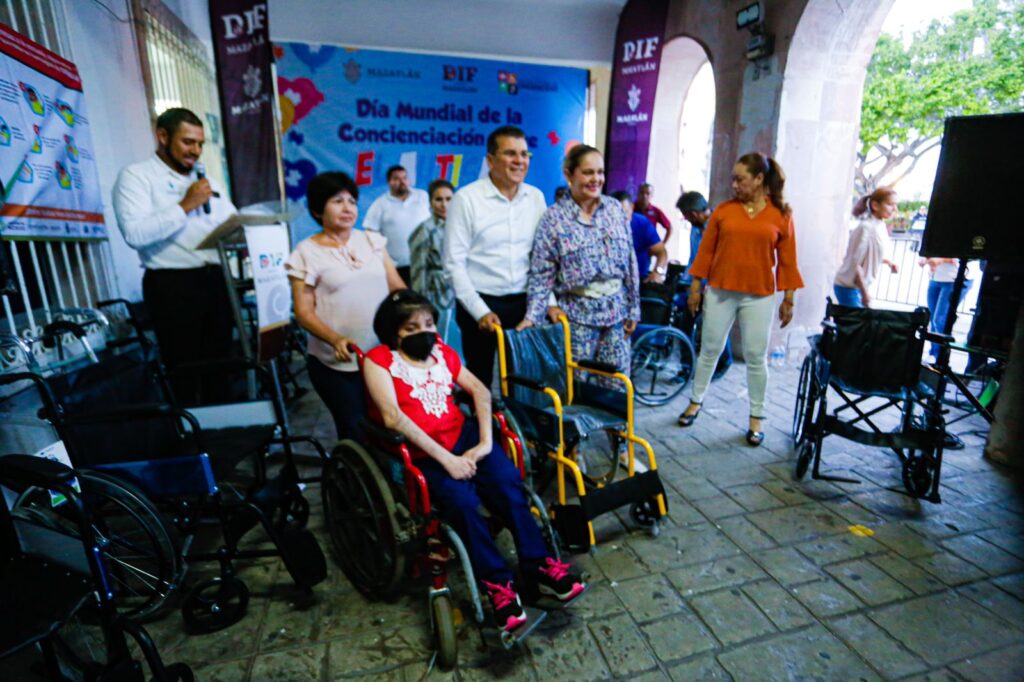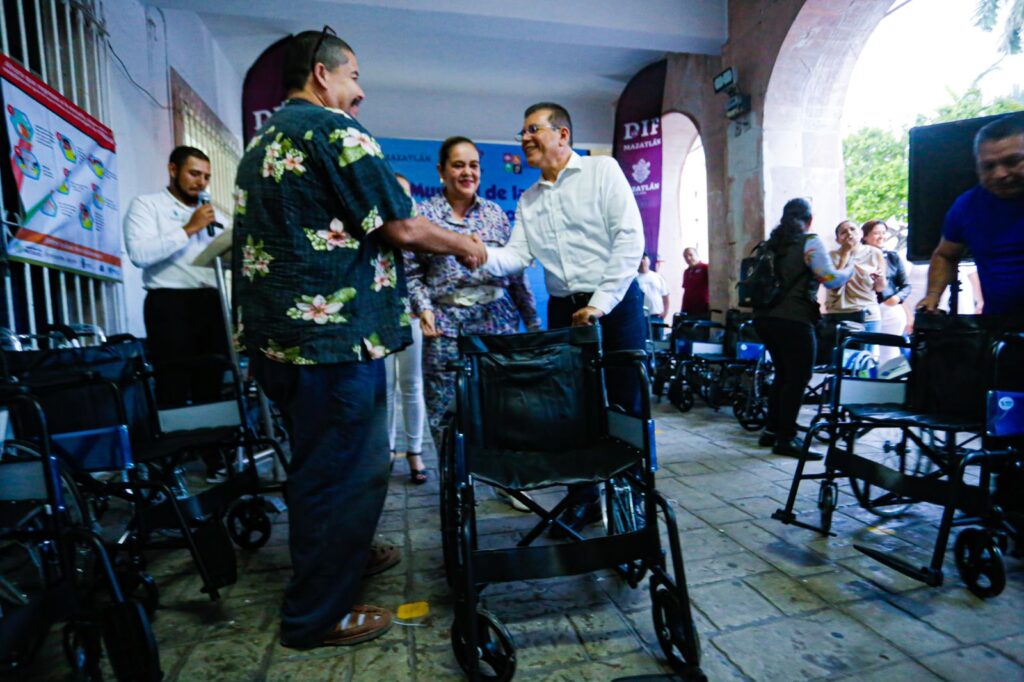 Durante el acto, el Alcalde y la presidenta de DIF Mazatlán entregaron 18 sillas de rueda para adulto, 2 para niñas y niños, así como 3 andaderas y 3 bastones.