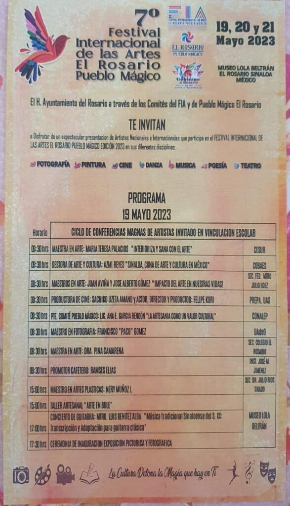 El Rosario, Sin.- Del 19 al 21 de mayo El Rosario Pueblo Mágico celebrará su séptimo Festival Internacional de las Artes con eventos que abarcan la fotografía, pintura, cine, danza, música, poesía y teatro.