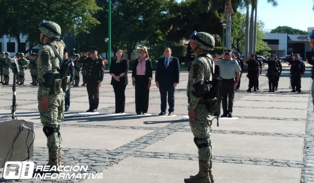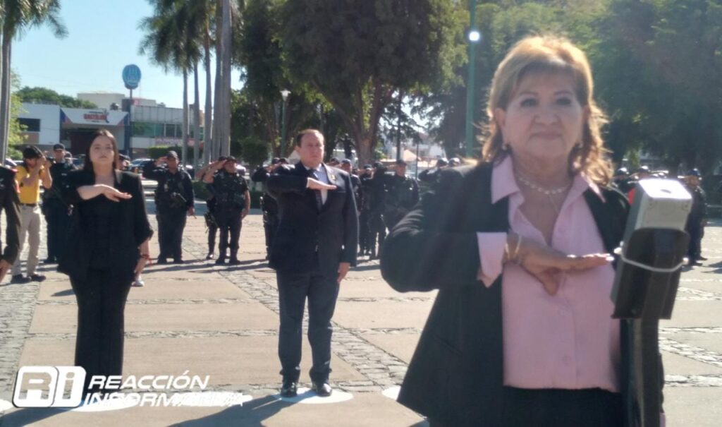 La encargada de realizar el izamiento, en representación del gobernador Rubén Rocha Moya fue la Secretaria de las Mujeres, María Teresa Guerra Ochoa.