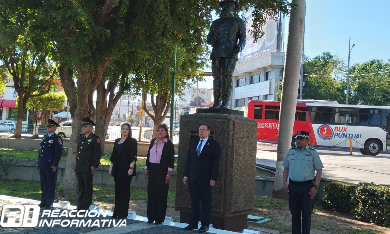 Tras concluir el izamiento del lábaro patrio y escuchar las gloriosas notas del himno nacional mexicano, los presentes se ubicaron en el monumento de Venustiano Carranza para realizar una pequeña guardia de honor donde escucharon una semblanza de uno de los héroes revolucionarios y ex presidente de México.