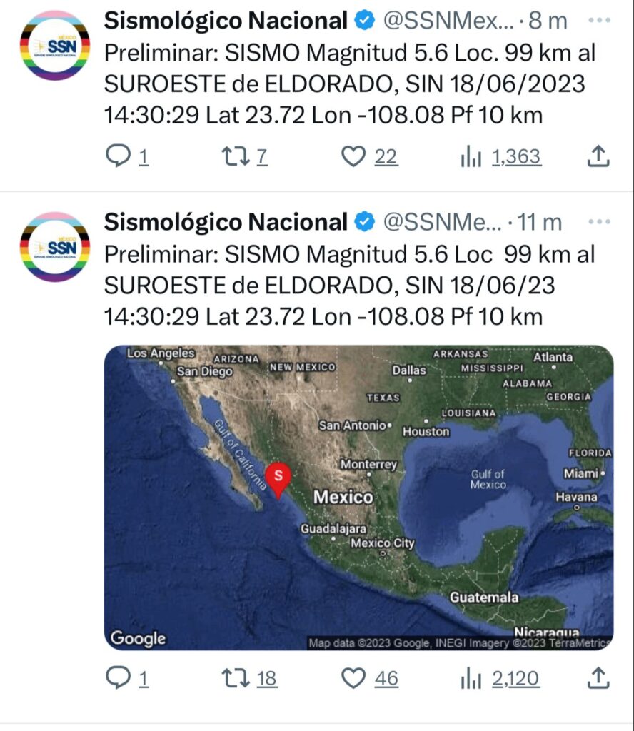 Mazatlán, Sin (Reacción Informativa).- La tarde de este domingo 18 de junio, el Servicio Sismológico Nacional reportó un sismo a 99 kilómetros de la comunidad El Dorado en Sinaloa, el cual tuvo una magnitud de 5.6, ocurrido alrededor de las 13:40 horas, tiempo local.