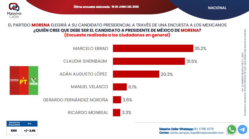 Los resultados de la encuesta posicionaron a Marcelo Ebrard como el favorito con el 35.2%, un poco detrás de él se encuentra Claudia Sheinbaum con el 31.5%, Adán Augusto López en tercer lugar con el 20.3%, Manuel Velasco con el 6.1%, Gerardo Fernández con el 3.6%, y en último lugar Ricardo Monreal, con el 3.3%.