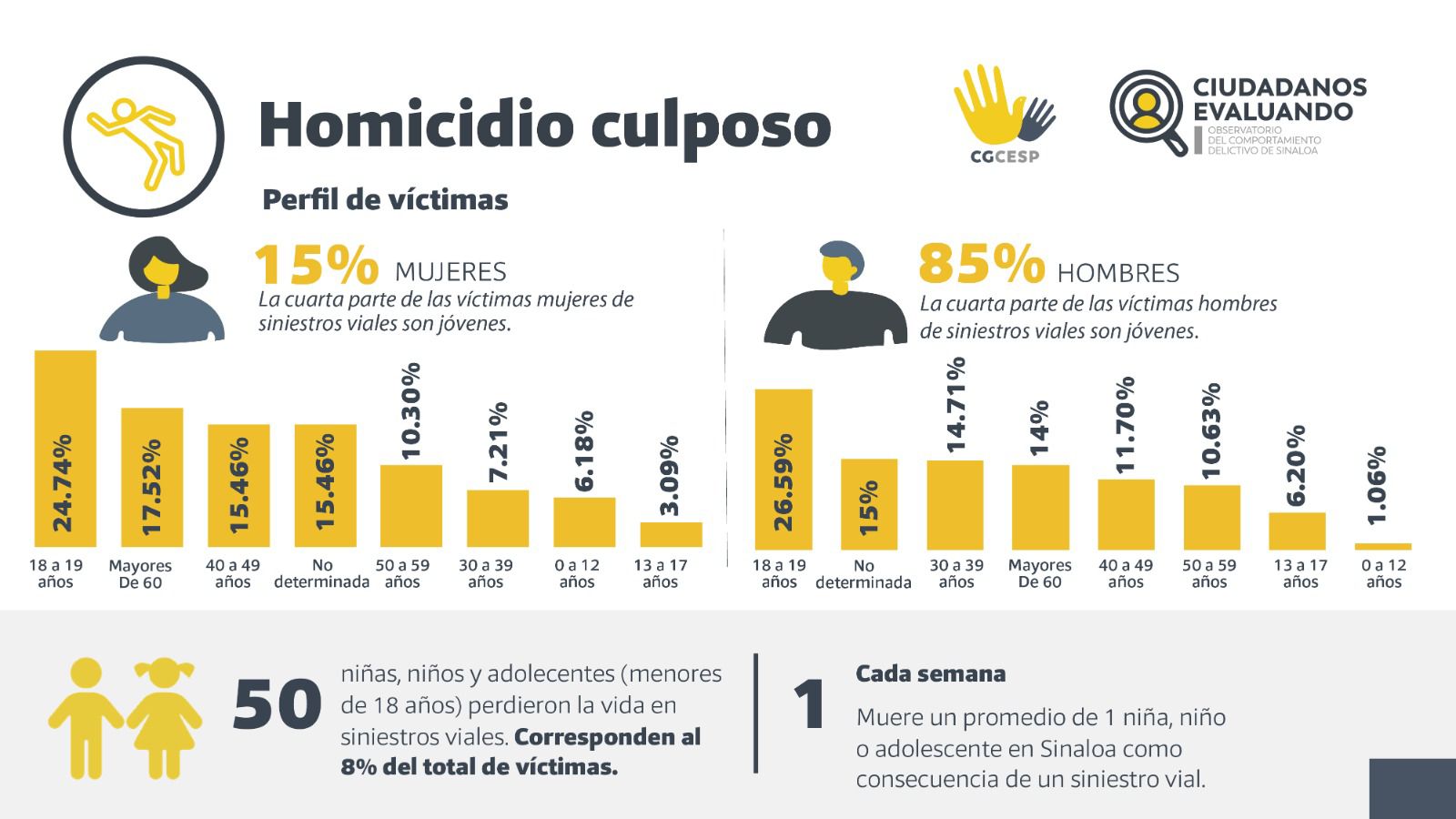 Dentro del perfil de las víctimas por homicidio culposo se indica que el 85% corresponde a hombres, mientras que el 15% corresponde a mujeres, en ambos géneros el mayor porcentaje se encuentra entre los rangos de edad de 18 a 29 años.