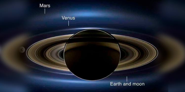 Cassini no sólo captó al gigante gaseoso, sino también a Venus, Marte, la Tierra y la Luna terrestre visibles como pequeños puntos de luz.