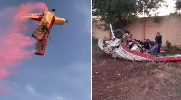 La caída de la aeronave quedó captada en video, pues una persona invitada a la celebración grabó el instante en que, después de sobrevolar el área y dejar caer una sustancia color rosa, un ala del vehículo se rompió e hizo que el piloto perdiera el control.