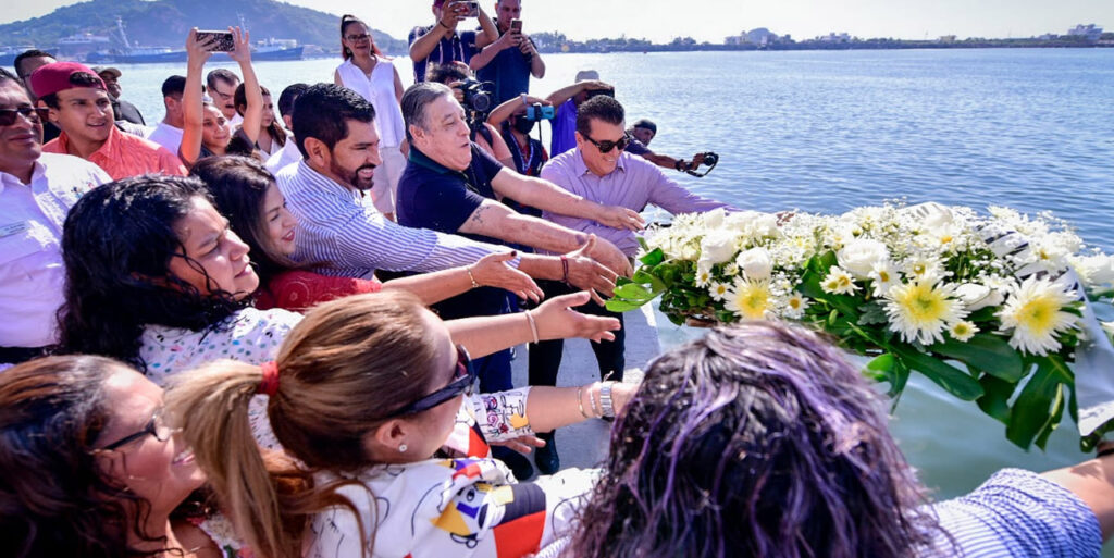 Los miembros del presidium depositaron la ofrenda florar al pie de la virgen de La Puntilla, posteriormente la ofrenda se lanzó al mar en honor a todos los pescadores que han perdido la vida en el mar.