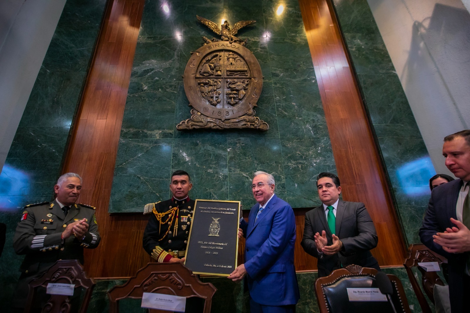 Culiacán, Sinaloa._Como un merecido y justo reconocimiento a la institución más respetada y apreciada por los mexicanos por su aportación con cuadros calificados técnica, teórica y cívicamente a las fuerzas armadas de la nación, calificó el Gobernador Rubén Rocha Moya la develación de la Inscripción en Letras Doradas de la Leyenda “2023, Año del Bicentenario del Heroico Colegio Militar”, al acudir este lunes a la Sesión Solemne del H. Congreso del Estado de Sinaloa con este motivo, acto al que también asistieron como invitados de honor el General de División D. E. M. Francisco Jesús Leana Ojeda, Comandante de la Tercera Región Militar y Jesús Iván Chávez Rangel, Presidente del Supremo Tribunal de Justicia del Estado.