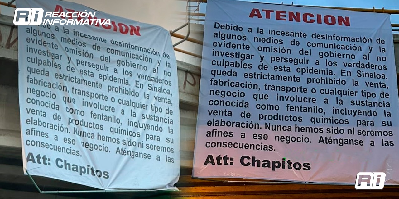 Culiacán, Sin (Reacción Informativa). – Este lunes en diversos puntos del Estado de Sinaloa, aparecieron mantas colgadas donde se denuncia la persistente desinformación proveniente de algunos medios de comunicación y se señala la aparente omisión del gobierno al no investigar y perseguir a los verdaderos responsables de la epidemia de fentanilo que azota la región.