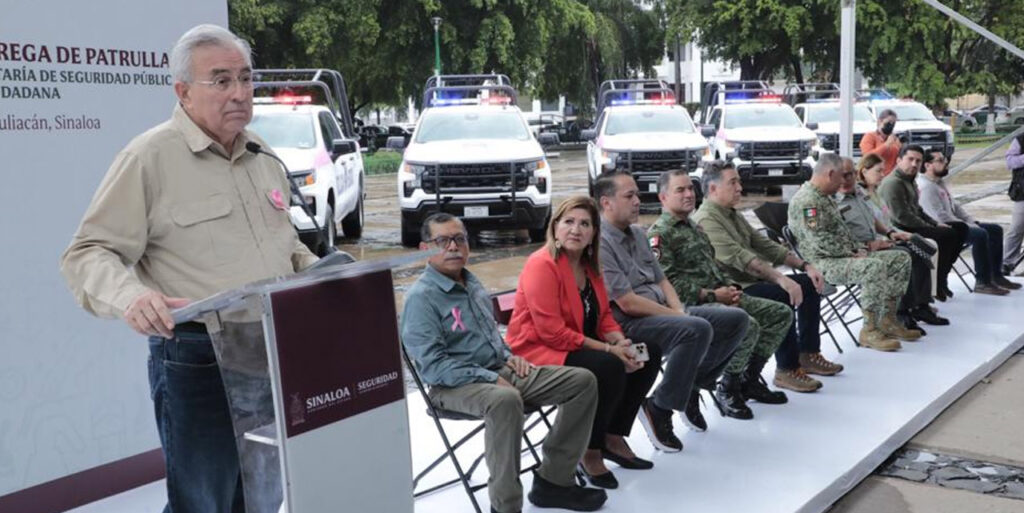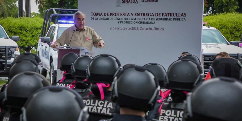 Culiacán, Sinaloa.- El gobernador Rubén Rocha Moya acompañado por la secretaria de las Mujeres María Teresa Guerra Ochoa realizó la toma de protesta de la Unidad de Género de la Secretaría de Seguridad Pública y Protección Ciudadana e hizo entrega de 12 patrullas a esta nueva unidad con las que realizarán el trabajo de salvaguardar y prevenir los hechos de violencia en contra de las mujeres.
