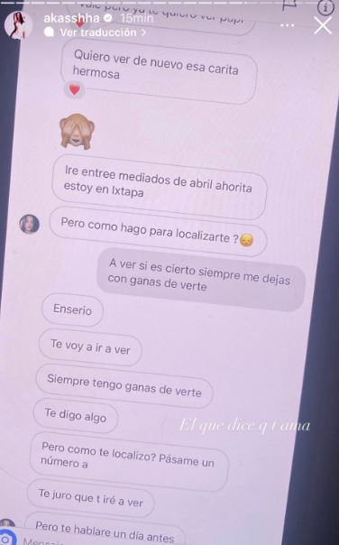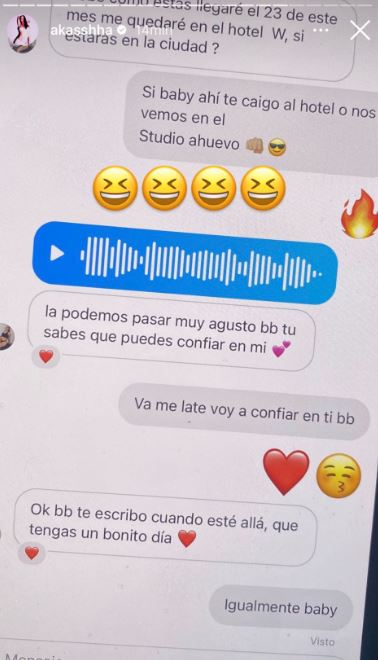Además de las conversaciones que probarían la infidelidad, Akasha compartió un audio en sus historias de Instagram en las que se escucha, a quien quizá es Aleman, discutiendo y diciendo a alguien que nunca va a encontrar a una persona con tanto dinero. Mientras la voz de una mujer grita asustada que se quiere bajar de lo que quizá es un automóvil, pues iban a chocar.