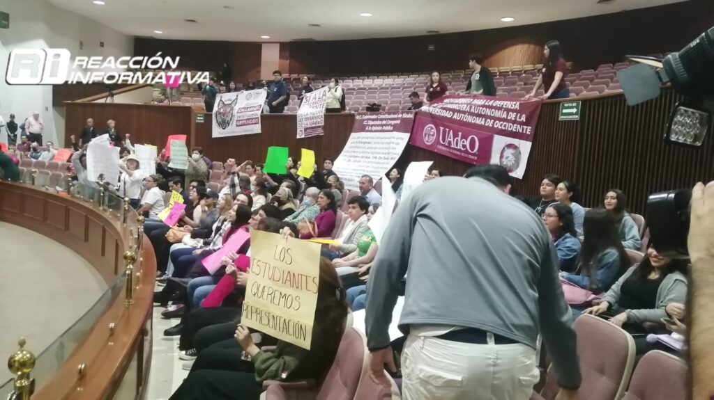 Culiacán, Sin (Reacción Informativa).- Esta mañana decenas de estudiantes, maestros y administrativos de la Universidad Autónoma de Occidente (UAdeO) de los campus Culiacán, Guamúchil, Guasave y Los Mochis llegaron al Congreso del Estado para pedir a los diputados se realice una pronta reforma a la Ley Orgánica de dicha universidad, pues están en total desacuerdo en la designación de Pedro Flores como Rector de esta casa de estudios, ya que aseguran no se les tomó en cuenta.