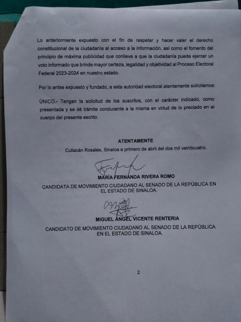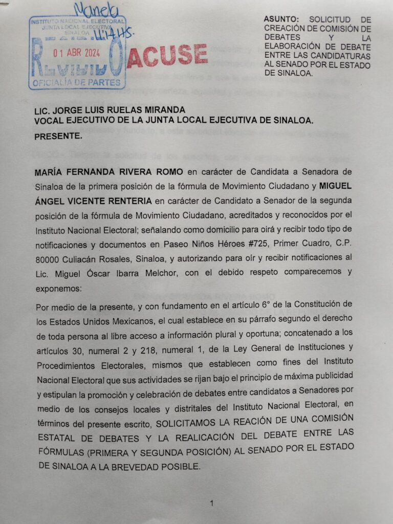 Culiacán, Sin.- Fernanda Rivera y Miguel Vicente, candidatos al Senado por Movimiento Ciudadano, solicitaron ante el INE la petición para que este organice por lo menos un debate entre los aspirantes al Senado de la República en Sinaloa.