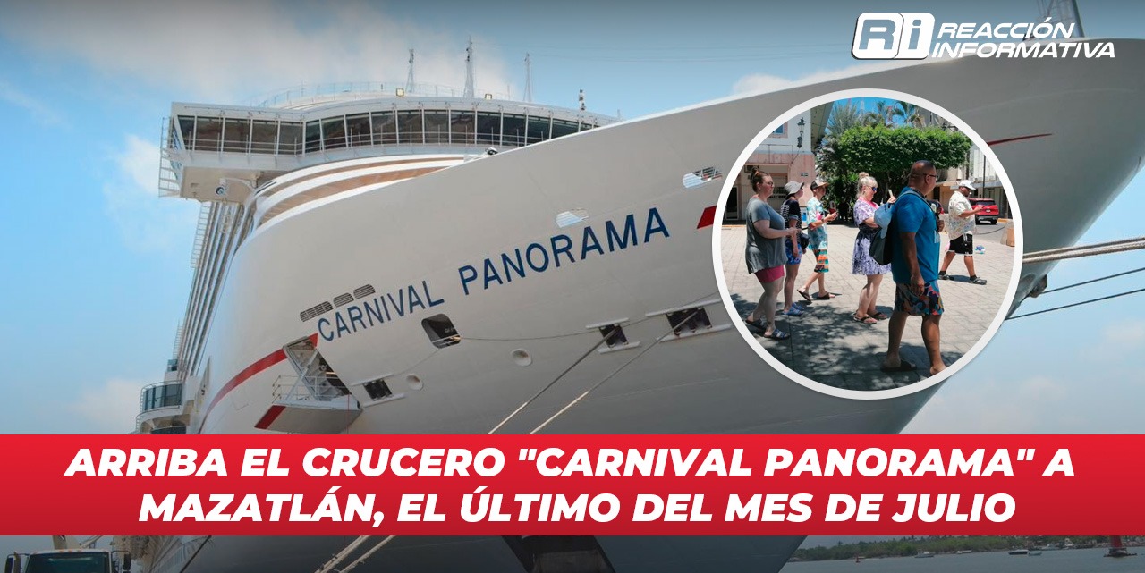 Mazatlán, Sin (Reacción Informativa).- Este miércoles, el crucero “Carnival Panorama” llegó al puerto de Mazatlán, siendo el último arribo de cruceros programado para el mes de julio. La embarcación trajo consigo a 4 mil 945 pasajeros y mil 409 tripulantes, quienes tendrán la oportunidad de disfrutar de las atracciones turísticas y culturales que ofrece la ciudad.