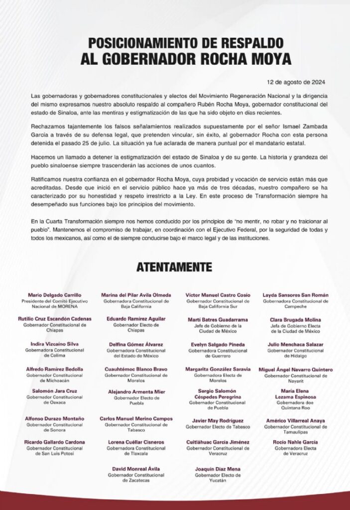 “Las gobernadoras y gobernadores constitucionales del Movimiento de Regeneración Nacional y la dirigencia de este expresamos nuestro absoluto respaldo al compañero Rubén Rocha Moya, gobernador constitucional del estado de Sinaloa, ante las mentiras y estigmatización de las que ha sido objeto en días recientes”, dice el documento titulado Posicionamiento de respaldo.