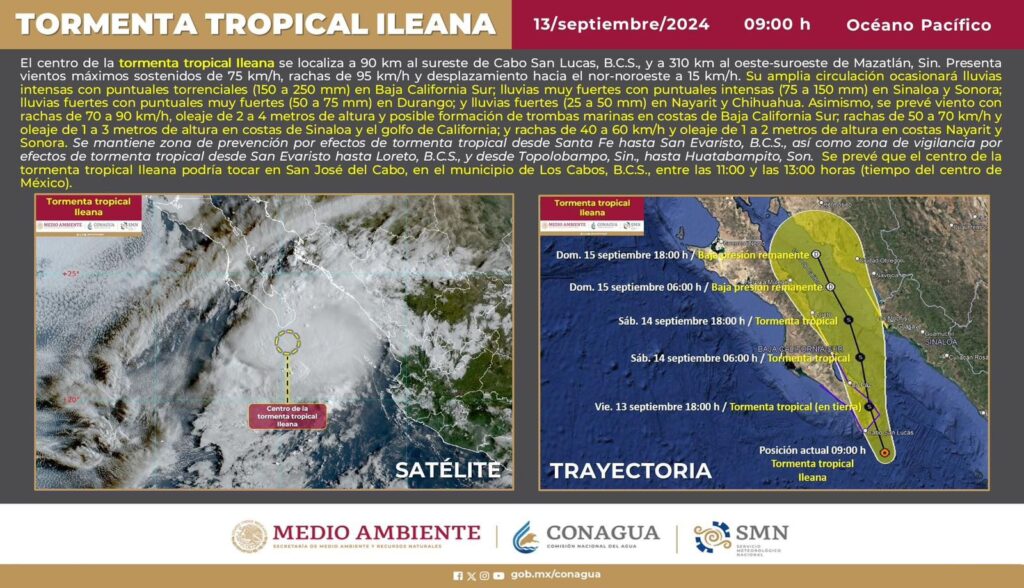 Mazatlán, Sinaloa (RI Noticias). – La Tormenta tropical “Ileana” continúa su trayectoria hacia Baja California Sur, se espera que para medio día de hoy empiecen a tocar tierra las primeras bandas nubosas. Conforme transcurran las horas este fenómeno tropical estaría acercándose a Sinaloa, donde pudiese llegar a afectar la zona norte del estado durante la madrugada del sábado, así lo dio a conocer Eloy Ruiz Gastelum, coordinador de protección civil en Mazatlán.