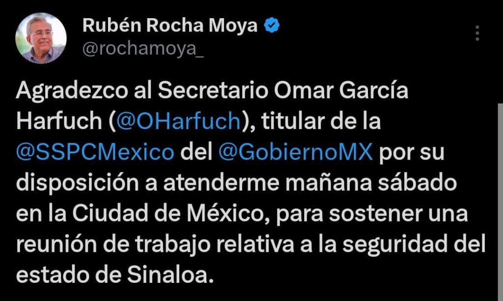 “Agradezco al Secretario Omar García Harfuch (@OHarfuch), titular de la @SSPCMexico del @GobiernoMX por su disposición a atenderme mañana sábado en la Ciudad de México, para sostener una reunión de trabajo relativa a la seguridad del estado de Sinaloa.”, se lee en el mensaje.