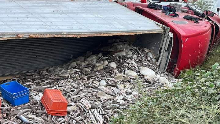 Ante la volcadura la caja del tráiler se dañó y el pescado resultó regado por todo el lugar, afortunadamente el conductor de la unidad no resultó herido de gravedad y solo fueron daños materiales.