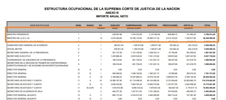 Actualmente los ministros y ministras de la Corte perciben un salario anual neto o libre de impuestos de 3 millones 295 mil 417.09 pesos y el salario de la presidenta Norma Piña es el más alto, ya que percibe 3 millones 709 mil 512,45, según un documento del máximo tribunal.