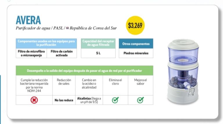 En el caso de la marca Avera no se cumple con esta norma, por lo que fue reprobado por Profeco. Este producto es originario de Corea del Sur y tiene un costo en el mercado de tres mil 269 pesos y aunque cumple con otros requisitos no tiene un buen desempeño en el más importante es que la eliminación de bacterias. Además, en su etiqueta promete cosas que no demuestra como: