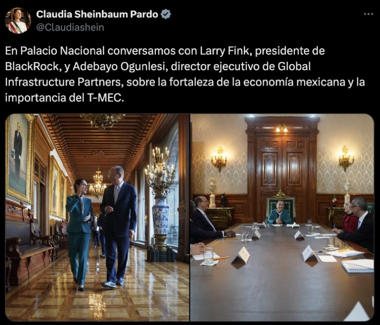 La presidenta de México, Claudia Sheinbaum se reunió con los empresarios estadounidenses Larry Fink, presidente de BlackRock, y Adebayo Ogunlesi, CEO de Global Infrastructure Partners, con el fin de tratar temas sobre economía as com del papel del T-MEC para los próximos años. El encuentro se llevó a cabo en Palacio Nacional.