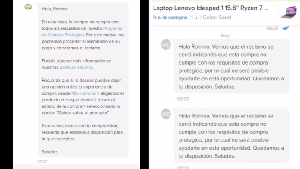 Tras descubrir el fraude, la usuaria levantó una queja en la plataforma de Mercado Libre, esperando una solución. Sin embargo, la respuesta fue desalentadora. “Hola, Romina. En este caso, la compra no cumple con todos los requisitos de nuestro Programa de Compra Protegida. Por este motivo, no podemos proceder al reembolso de su pago y cerraremos el reclamo”, respondió la plataforma.