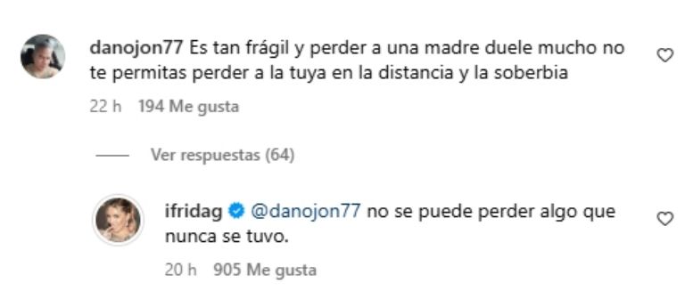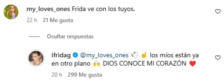 Una usuaria en Instagram le dijo a la cantante que debería viajar a la Ciudad de México para reunirse con los “suyos”, en referencia a su familia. Ante esta situación Frida Sofía dijo que su “familia” ya está en otro plano y solo Dios conoce a las personas que ocupan su corazón.