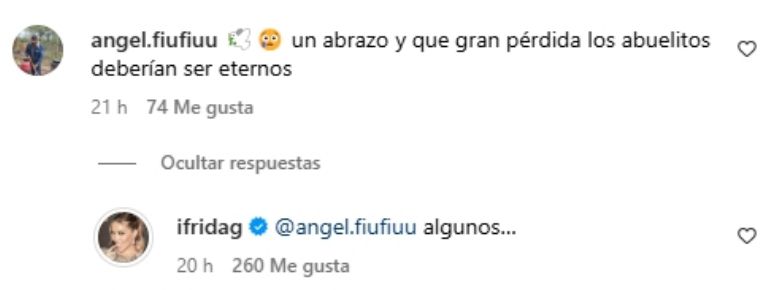 Finalmente, un internauta le expresó sus condolencias a Frida Sofía, diciéndole que los abuelitos deberían ser eternos. La cantante le envió una indirecta a su abuelo, Enrique Guzmán, con la respuesta de “algunos”. Cabe señalar que la joven señaló a su abuelo de abuso.