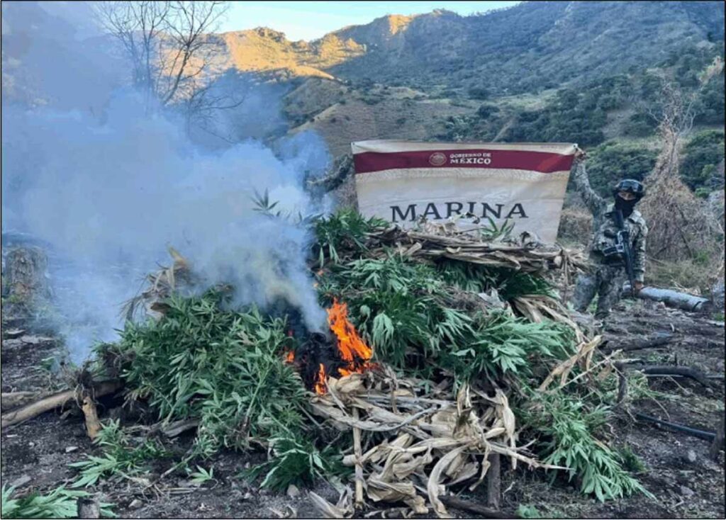 La primera acción se realizó en inmediaciones de la localidad “El Aguacate” en Tepic, Nayarit donde a través de un sobrevuelo de aeronaves navales, se localizó cuatro plantíos de marihuana en un área total de 8,700 metros cuadrados, con aproximadamente 164 mil plantas de marihuana, las cuales fueron erradicadas en el lugar.