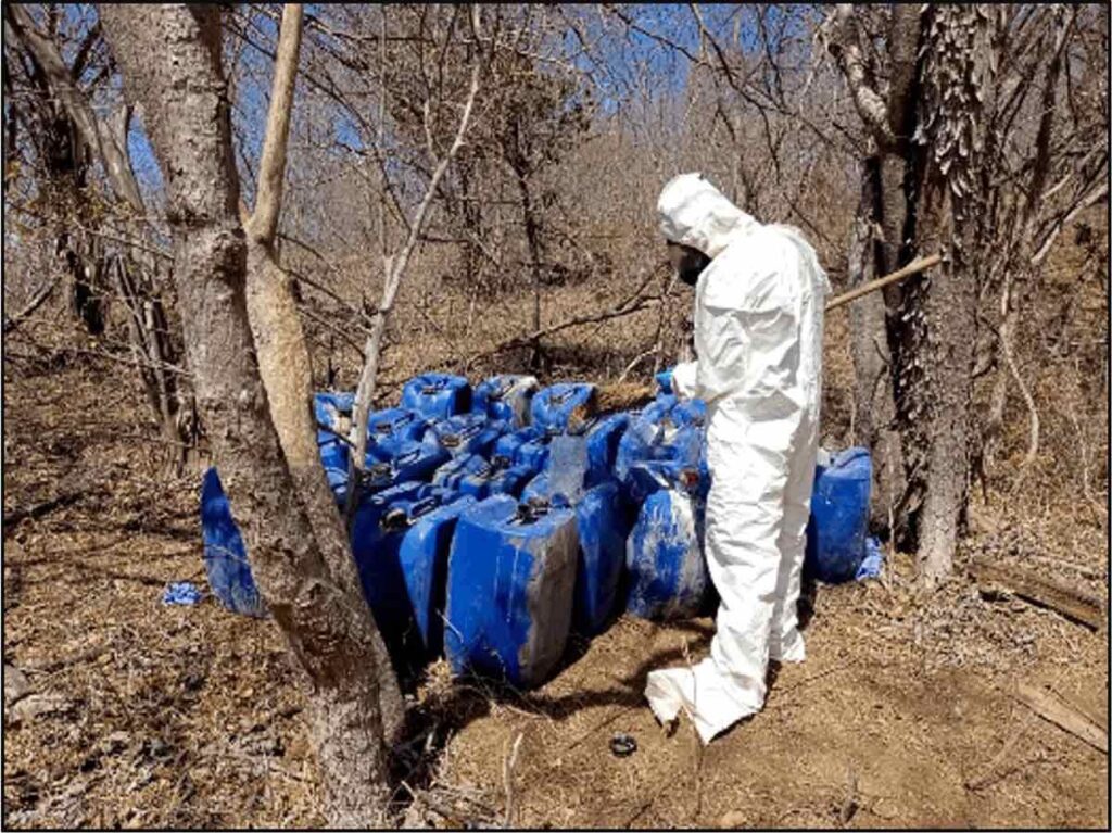 En otra acción, elementos de infantería capacitados en detección y destrucción de laboratorios clandestinos de la Armada de México, ubicaron en el municipio de Cosalá, Sinaloa, derivado de información de inteligencia en coordinación con personal de la Fiscalía General de la República (FGR) y Semar localizó dos laboratorios clandestinos, en donde aseguraron 1,050 litros de precursores químicos líquidos, 210 kilogramos de químicos esenciales, cinco destiladores y material diverso, en inmediaciones de los poblados de San Francisco Tacuichamona y Palo Dulce.
