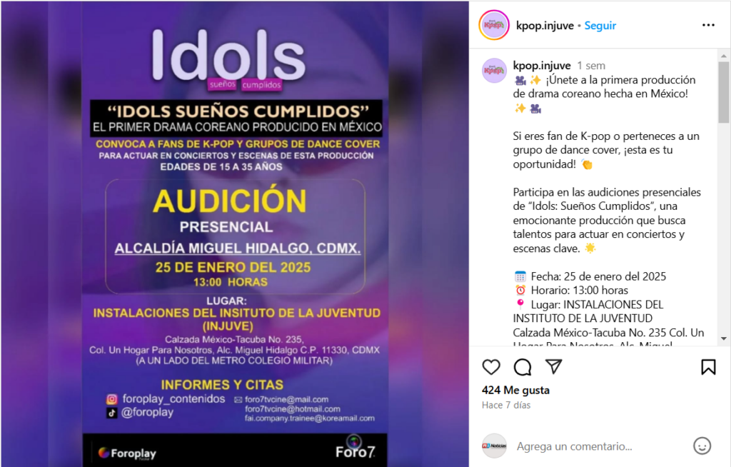 A través de las redes oficiales del Injuve, se anunció el primer drama coreano producido en México. En alianza con Foro Play, estudio de cine y televisión, el instituto juvenil lanzó la convocatoria para asistir al casting que se realizará el próximo sábado en la alcaldía Miguel Hidalgo.