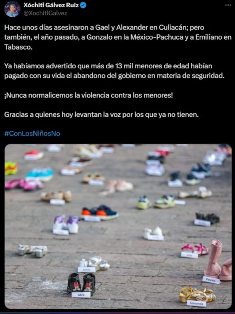 “Hace unos días asesinaron a Gael y Alexander en Culiacán; pero también, el año pasado, a Gonzalo en la México-Pachuca y a Emiliano en Tabasco. Ya habíamos advertido que más de 13 mil menores de edad habían pagado con su vida el abandono del gobierno en materia de seguridad. ¡Nunca normalicemos la violencia contra los menores! Gracias a quienes hoy levantan la voz por los que ya no tienen. #ConLosNiñosNo”, escribió en la red social.