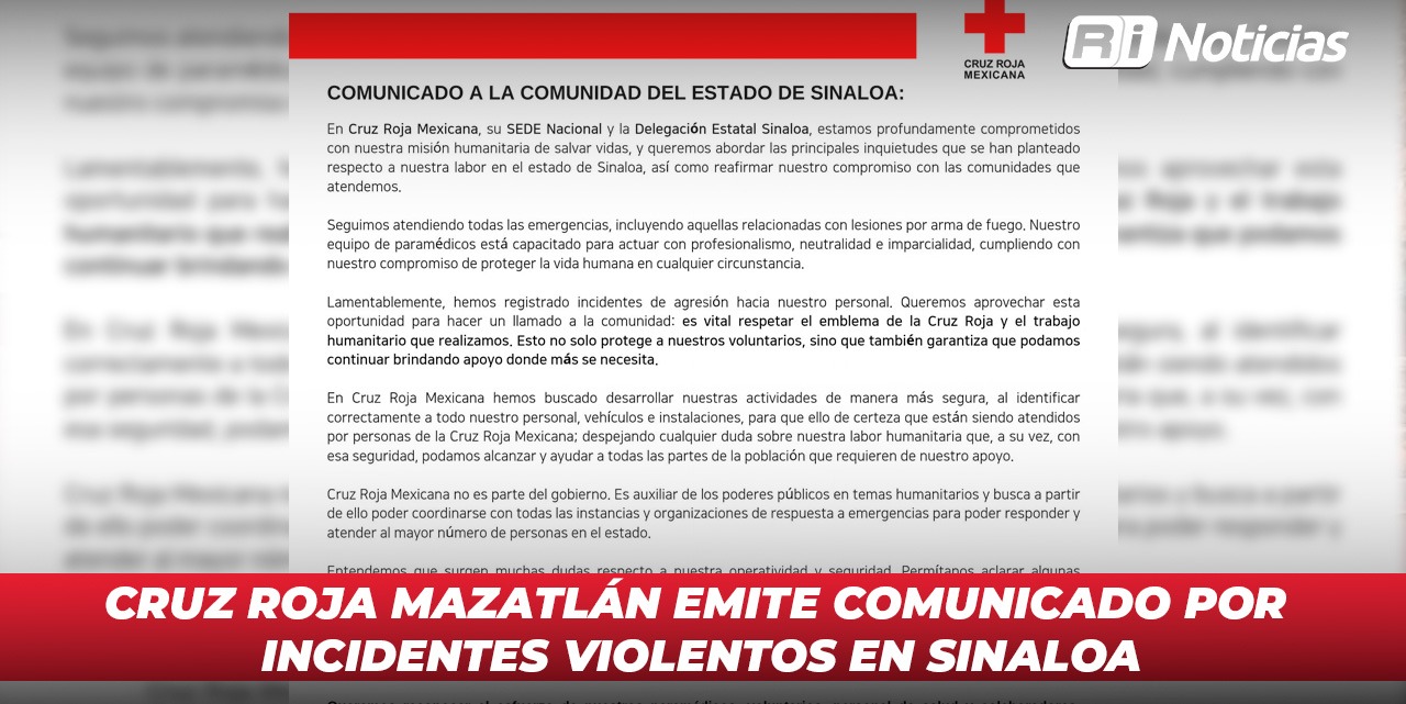 Mazatlán, Sin. (RI Noticias). – Tras los incidentes ocurridos en Culiacán, Sinaloa, que han afectado la seguridad de la Cruz Roja Mexicana, la Delegación Mazatlán emitió un comunicado dirigido a la comunidad estatal. En este documento, reitera su compromiso con la misión humanitaria de salvar vidas, incluso en situaciones de alto riesgo.