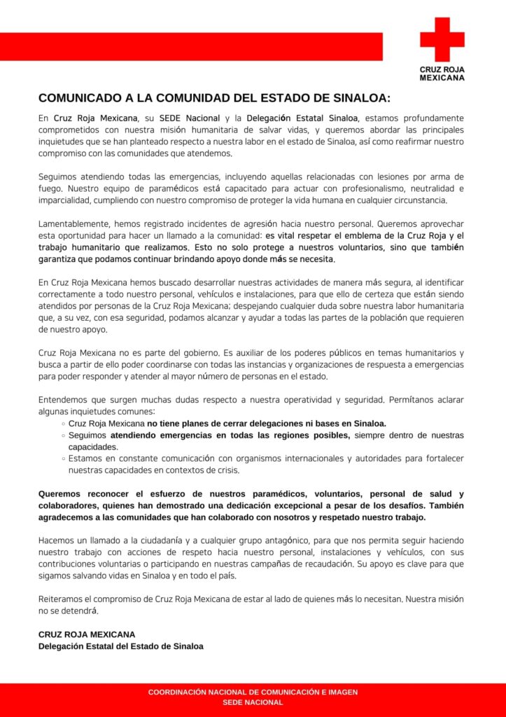 Maztlán, Sin.- (RI Noticias) – Tras los incidentes ocurridos en Culiacán, Sinaloa, que han afectado la seguridad de la Cruz Roja Mexicana, la Delegación Mazatlán ha emitido un comunicado dirigido a la comunidad estatal. En este documento, reitera su compromiso con la misión humanitaria de salvar vidas, incluso en situaciones de alto riesgo.