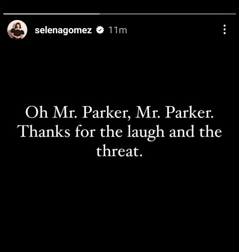 “Oh, señor Parker, señor Parker, gracias por las risas y por las amenazas”, compartió Selena Gómez en una historia de Instagram donde tiene más de 244 millones de seguidores.