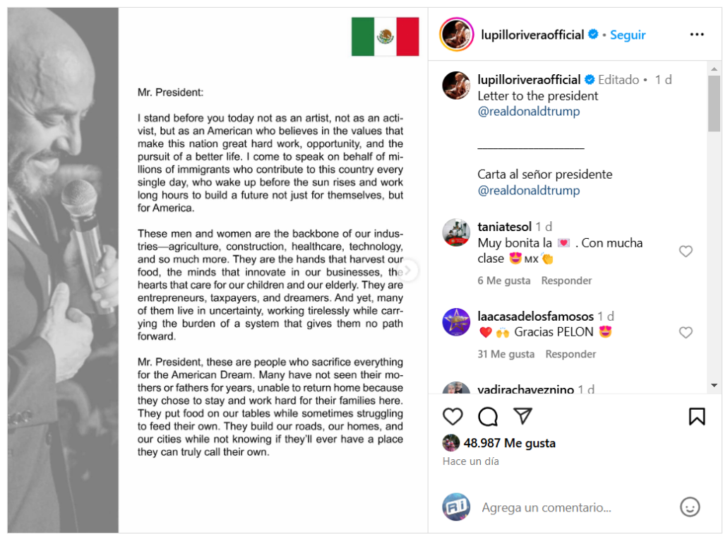 Fue así como Lupillo Rivera hizo uso de su cuenta de Instagram para enviar una extensa carta a Trump, en donde le hizo un contundente llamado a respetar los derechos humanos de los migrantes y reconocer su importancia en la economía de Estados Unidos.