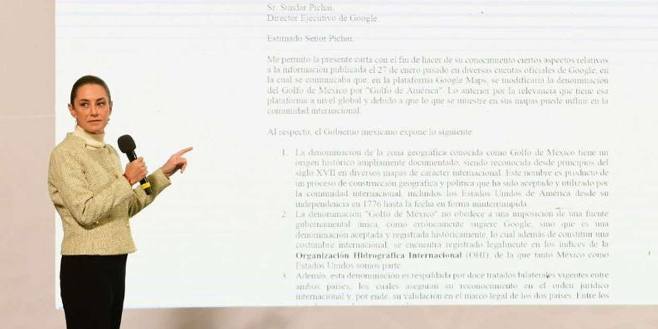 La carta que envió la Secretaría de Relaciones Exteriores a Google, para atender la definición del Golfo de México, fue expuesta por la presidenta Claudia Sheinbaum Pardo. En la Mañanera de este 30 de enero, la titular del Ejecutivo federal retomó una convención de Naciones Unidas, acordada en Jamaica en 1982.