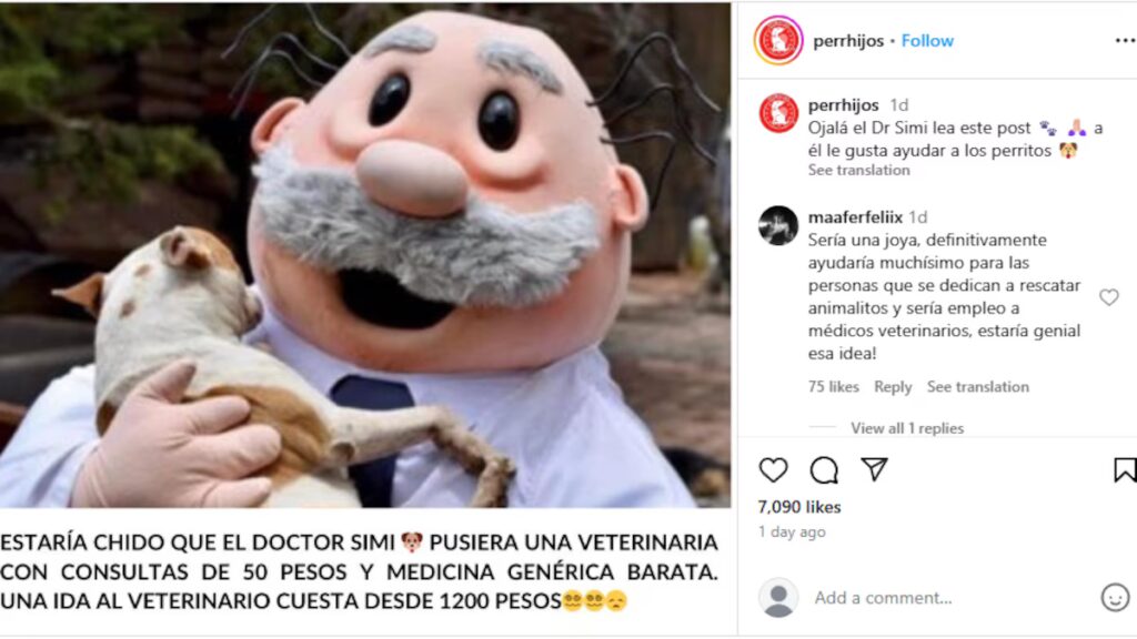 “Estaría chido que el doctor Simi pusiera una veterinaria con consultas de 50 pesos y medicina genérica barata. Una ida al veterinario cuesta desde 12 mil pesos”, se lee en una publicación de la página Perrhijos.