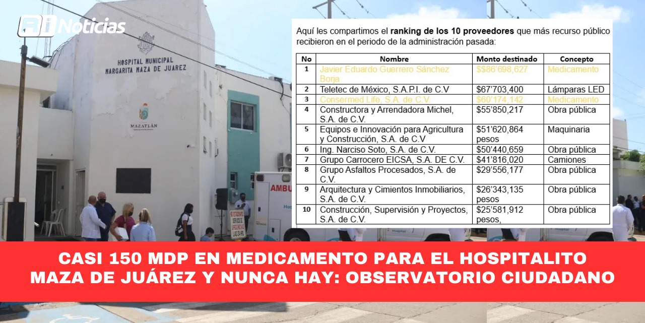 Mazatlán, Sinaloa (RI Noticias).- Con una cantidad de 146,872,769 el H. Ayuntamiento de Mazatlán, pagó en medicamentos, durante la administración pasada, por lo que el Observatorio Ciudadano a través de su director, Gustavo Rojo, hace un señalamiento, ante la deficiencia que enfrenta el Hospital Margarita Maza de Juárez de los fármacos.