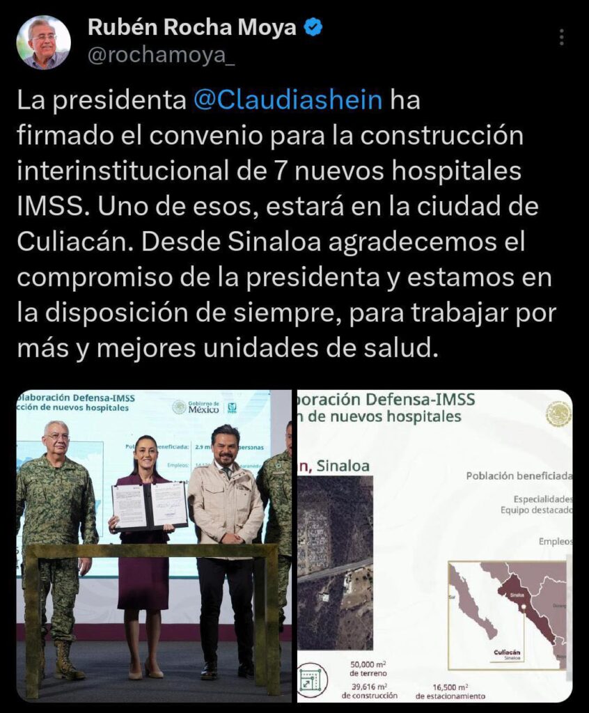 “La presidenta @Claudiashein ha firmado el convenio para la construcción interinstitucional de 7 nuevos hospitales IMSS. Uno de esos, estará en la ciudad de Culiacán. Desde Sinaloa agradecemos el compromiso de la presidenta y estamos en la disposición de siempre, para trabajar por más y mejores unidades de salud”, posteó.