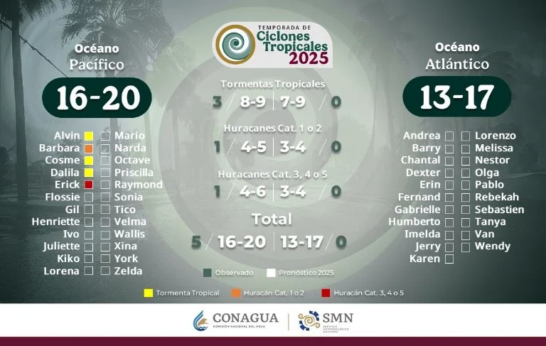 Para la temporada de huracanes 2025 se pronosticaron hasta 37 sistemas: de 16 a 20 en el Océano Pacífico y de 13 a 17 en el Océano Atlántico.