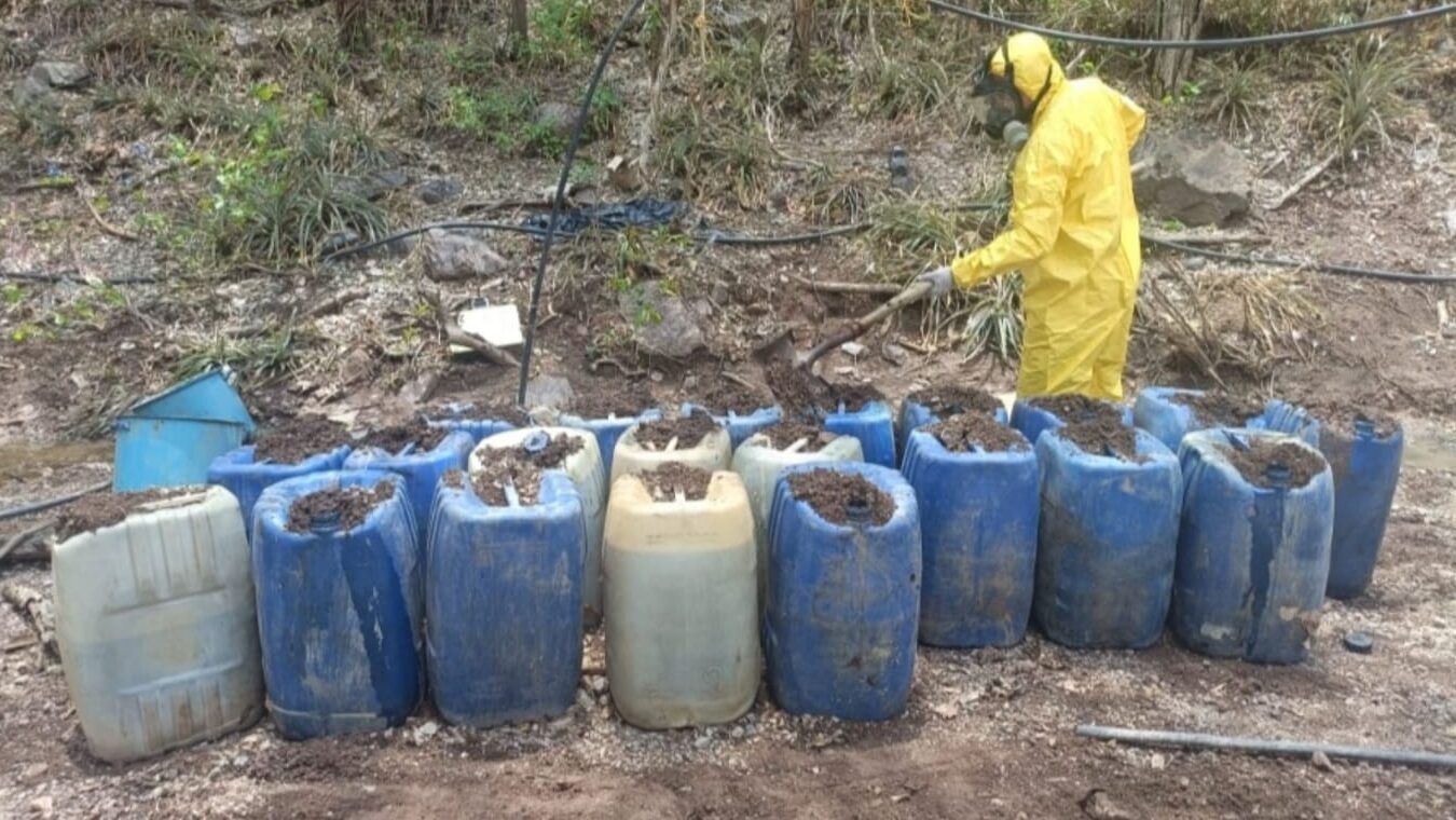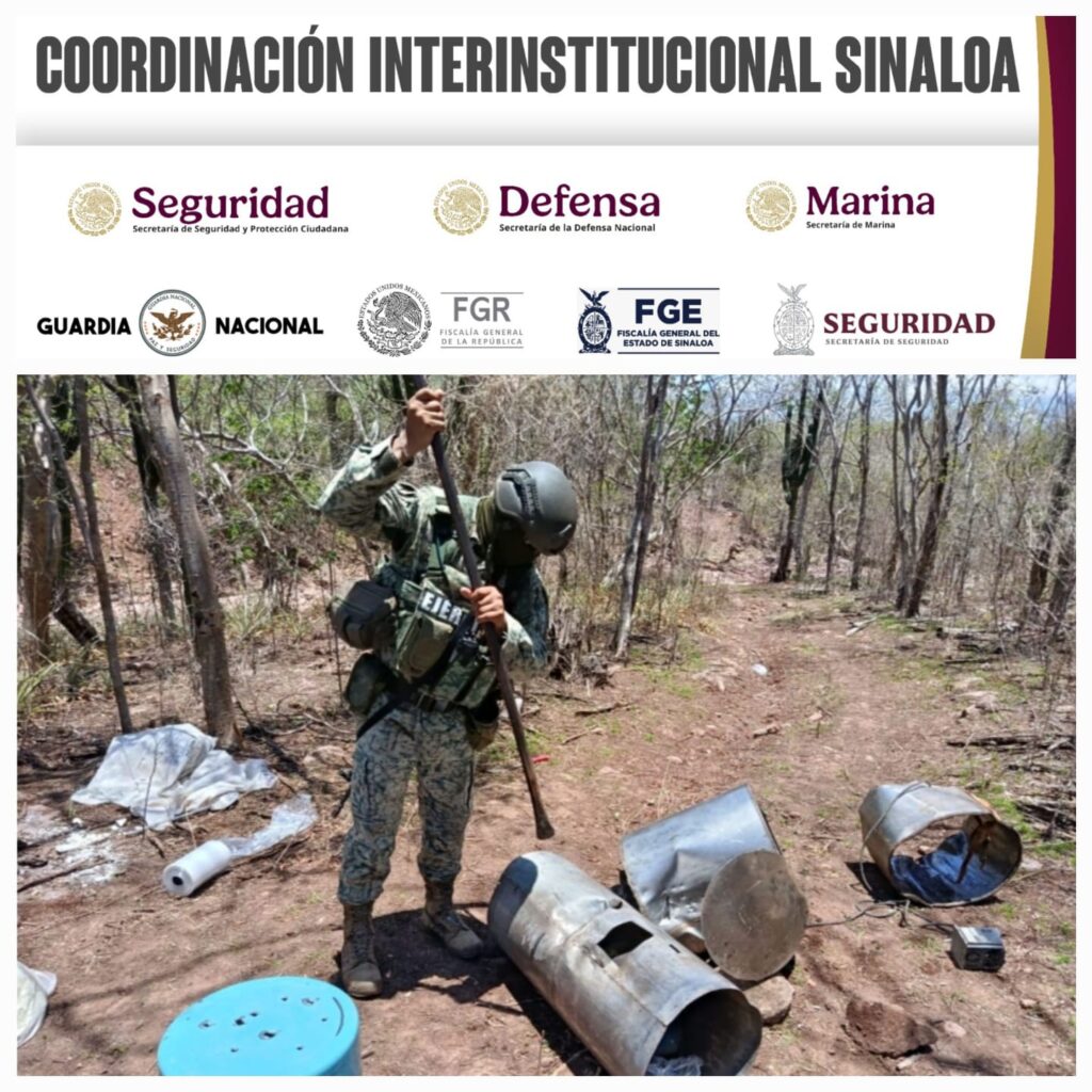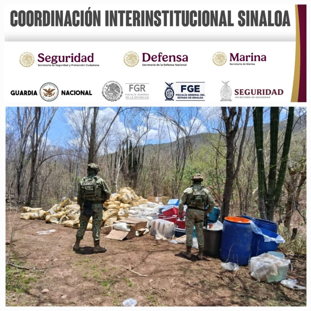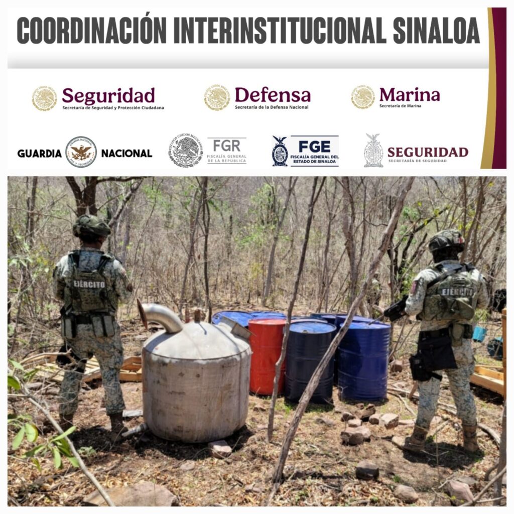 Culiacán, Sin (RI Noticias).- Personal del Ejército Mexicano, en coordinación con la Guardia Nacional, la Secretaría de Marina, la Secretaría de Seguridad y Protección Ciudadana, la Fiscalía General de la República, la Fiscalía General del Estado y la Secretaría de Seguridad Pública de Sinaloa, a través de la Policía Estatal Preventiva, localizó tres áreas de concentración de sustancias químicas y un laboratorio inactivo en los municipios de Culiacán y Cosalá.