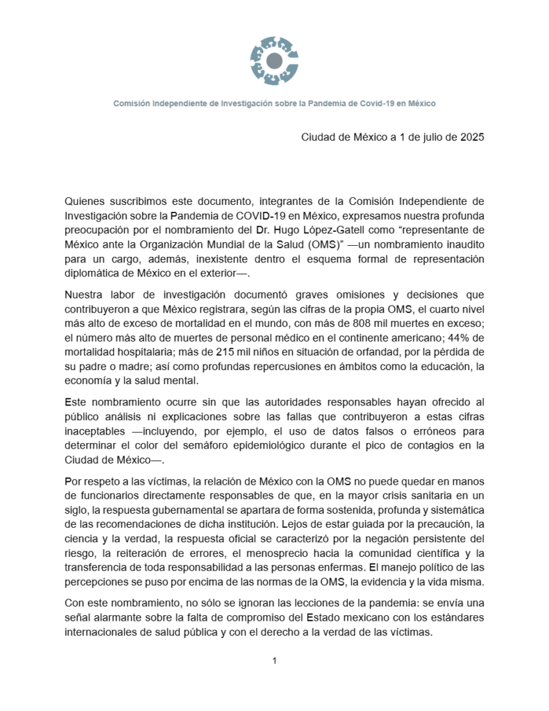 Los miembros de la Comisión Independiente de Investigación sobre la Pandemia de COVID-19 en México señalaron que con este nombramiento de López-Gatell ante la OMS “no solo se ignoran las lecciones de la pandemia: se envía una señal alarmante sobre la falta de compromiso del Estado mexicano con los estándares internacionales de salud pública y con el derecho a la verdad de las víctimas”.