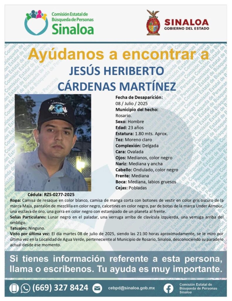 El Rosario, Sin (RI Noticias).- Familiares y amigos han emprendido la búsqueda de Jesús Heriberto Cárdenas Martínez de 23 años, quien se encuentra desaparecido desde el martes en la noche, cerca de las 22:00 horas en el tramo carretero que va de Agua verde a la cabecera municipal de El Rosario.