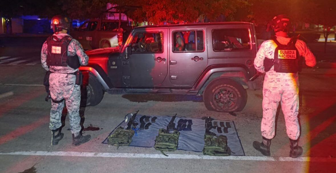 Al atender un reporte al 089 sobre personas armadas en el fraccionamiento Benevento, los elementos de la Guardia Nacional iniciaron la búsqueda, localizando tres vehículos que iniciaron una agresión armada, misma que repelieron. En el sector Los Ángeles lograron detener a tres de los presuntos responsables que, además, resultaron heridos. También aseguraron lo siguiente: