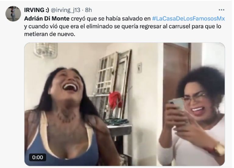 “Adrián se quería volver a meter a la casa porque pensó que se equivocaron y le cerraron más rápido la puerta, JAJAJA QUE HUMILLACIÓN“, “Mi México no lo podía hacer dos veces. No podía salvar a un misógino..”, “Justo hoy se veía más guapo que nunca Adrián Di Monte, todo de negro. ¡No te tocaba chiquito! ¡Estas hermoso! Lo mucho que perdemos los televidentes. Me siento devastada…” y “Adrián Di Monte creyó que se había salvado en La Casa de los Famosos México y cuando vio que era el eliminado se quería regresar al carrusel para que lo metieran de nuevo”, son algunos de los comentarios que aparecen en X y TikTok.