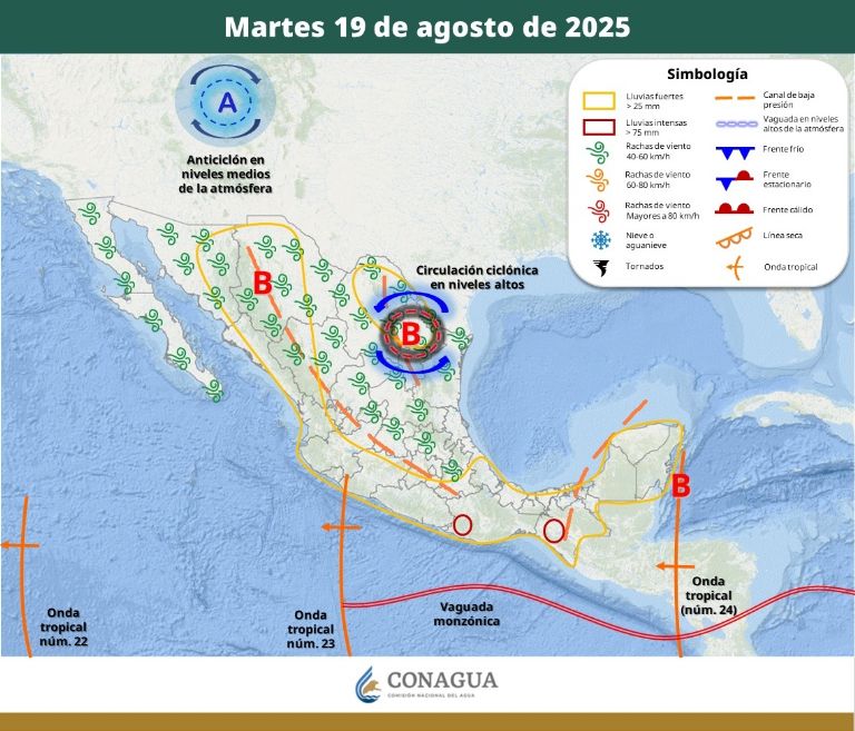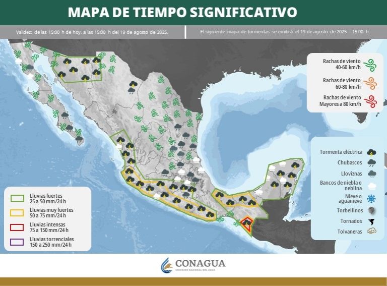Las fuertes lluvias se presentarán a lo largo de este 19 de agosto. En algunas entidades se vivirán en las primeras horas del día, mientras que en otros estados se harán presentes para la tarde o noche. El norte del país será uno de los lugares que más se verá afectado por el monzón mexicano para este martes. En el informe del SMN se indica que seis estados serán los más afectados.