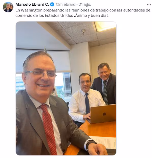 El pasado 21 de agosto, el titular de Economía Marcelo Ebrard informó que se encontraba en Washington como parte de las reuniones de trabajo con las autoridades de comercio de Estados Unidos.