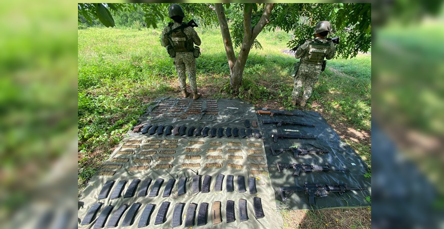 De acuerdo con la información oficial, los militares ubicaron el campamento oculto entre una zona de maleza y al realizar una inspección detallada, los elementos castrenses aseguraron un arsenal compuesto por una ametralladora, cinco armas largas, 45 cargadores abastecidos y 1,226 cartuchos de diferentes calibres.