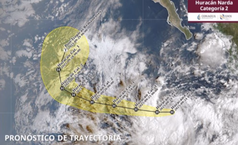 Por otro lado, el huracán Narda, también de categoría 2, se localiza en el Océano Pacífico, a 855 km al suroeste de Playa Pérula, Jalisco, y a 885 km al sur-suroeste de Cabo San Lucas, Baja California Sur.